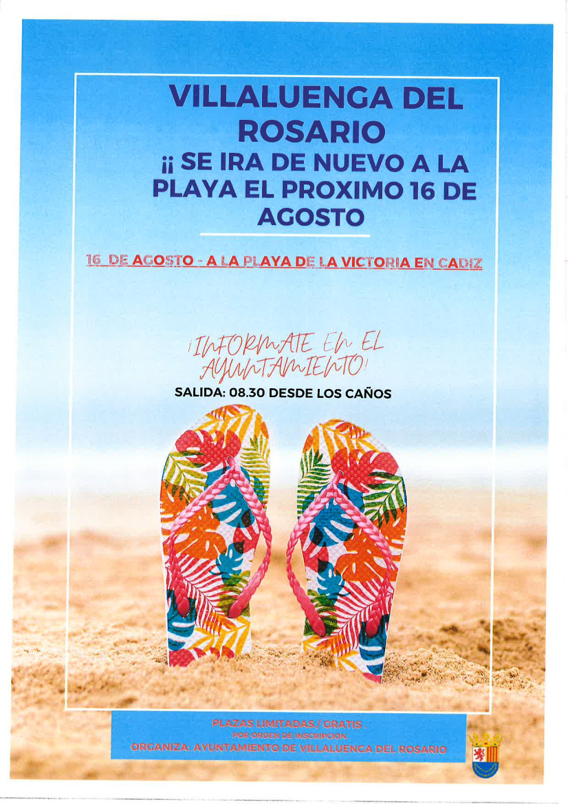 NUEVO VIAJE A LA PLAYA DESDE VILLALUENGA DEL ROSARIO Villaluenga del Rosario se va de nuevo a la playa este próximo sábado 16 de agosto. Gratis con plazas limitadas. Más información en el Ayuntamiento.