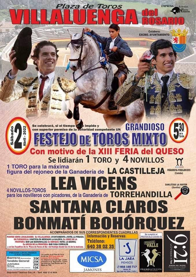 El próximo 2 de Abril, con motivo de la celebración de la Feria del Queso Artesanal de Andalucía de Villaluenga del Rosario, tendrá lugar un grandioso Festejo de toros mixto con Lea Vicens, Santana Claros y Bonmatí Bohórquez.