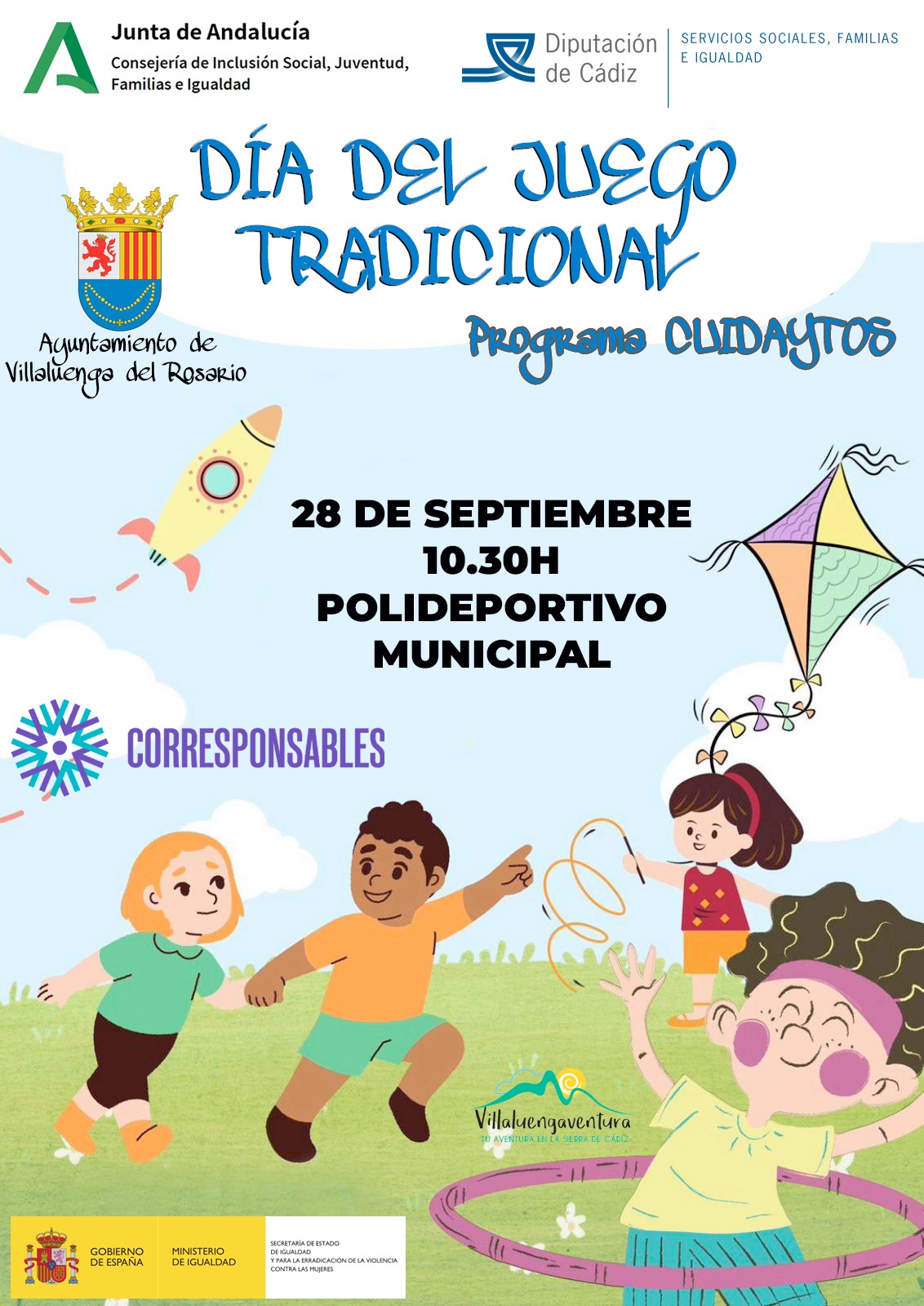 DÍA DEL JUEGO TRADICIONAL El Ayuntamiento de Villaluenga del Rosario organiza Día del Juego Tradicional. Programa CUIDAYTOS. CORRESPONSABLES. El próximo Sábado 28 de Septiembre a las 10:30h, en el Polideportivo Municipal.