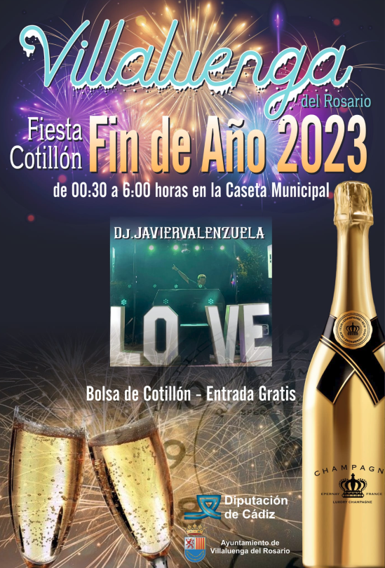 Para despedir el año Villaluenga del Rosario celebra una Fiesta Cotillón Fin de Año 2023 con entrada gratuita, de 00:30h a 06:00 horas en la Caseta Municipal.