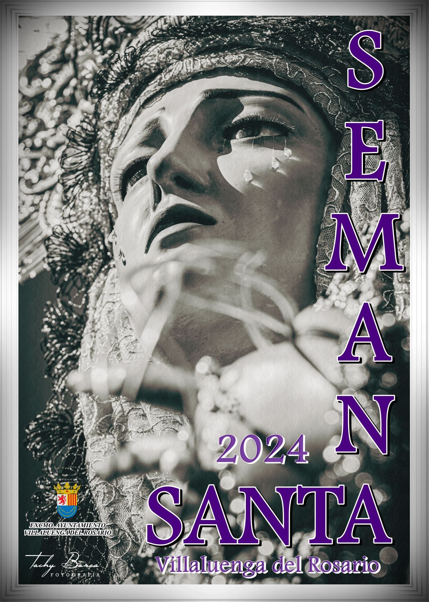Cultos a celebrar y Cartel Oficial de la Semana Santa en Villaluenga del Rosario 2024, sobrio y solemne, perfectamente diseñado para reproducir una imagen clave de lo que representa la Semana de Pasión.