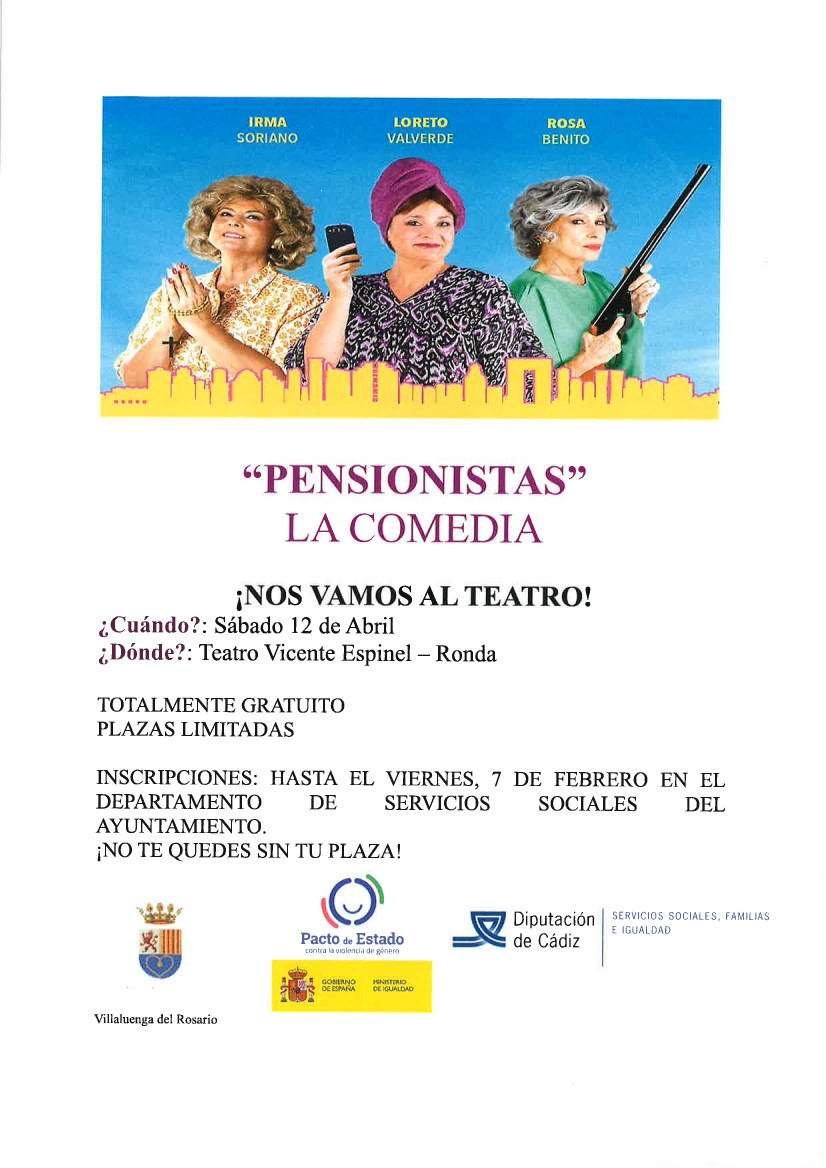 El Ayuntamiento de Villaluenga del Rosario organiza un viaje totalmente gratuito al teatro Vicente Espinel de Ronda, para ver la obra "Pensionistas" La Comedia.