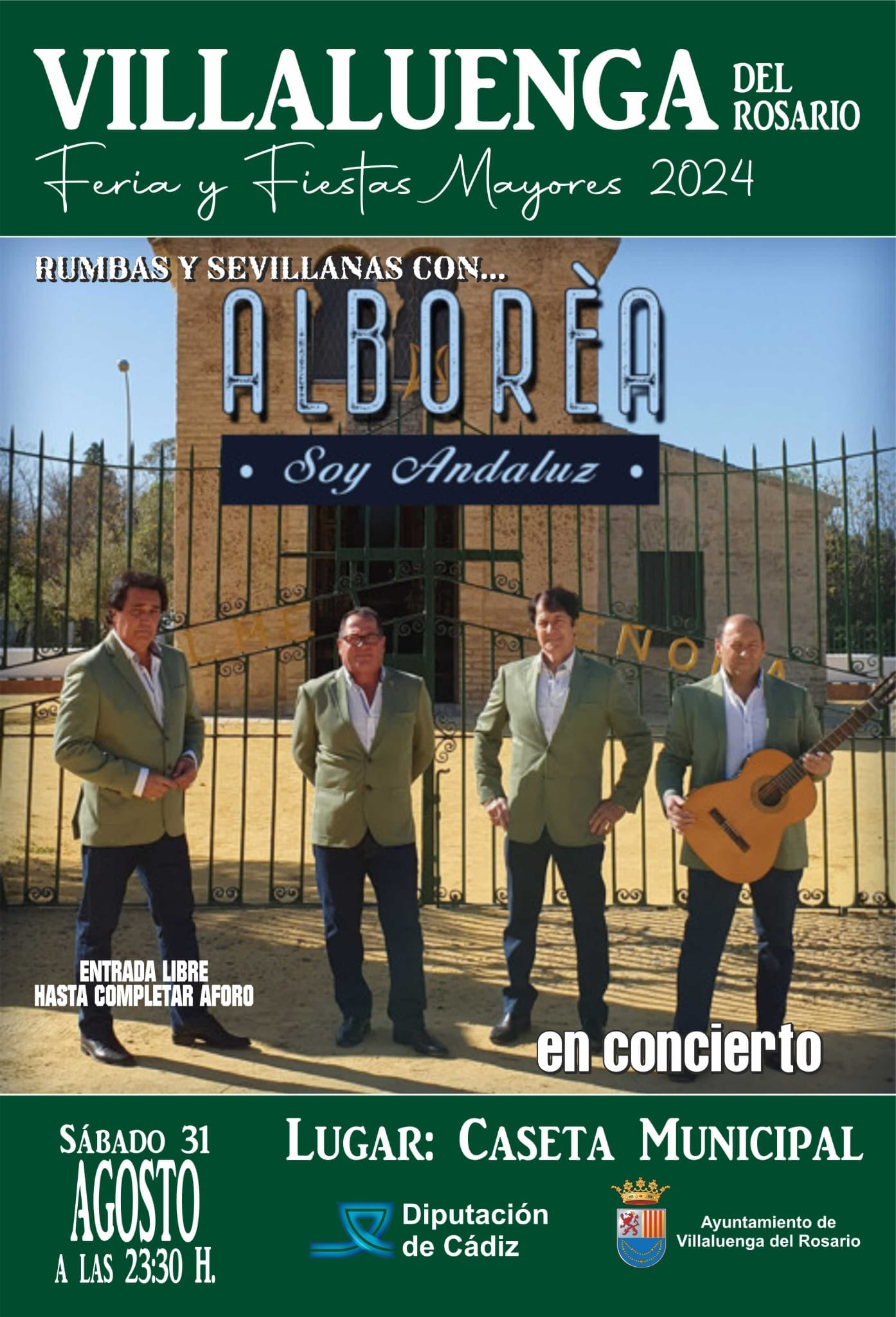 Rumbas y Sevillanas con Alboreá - Soy Andaluz- en Villaluenga del Rosario el próximo Sábado 31 de Agosto a las 23:30h en la Caseta Municipal, con entrada libre hasta completar aforo.