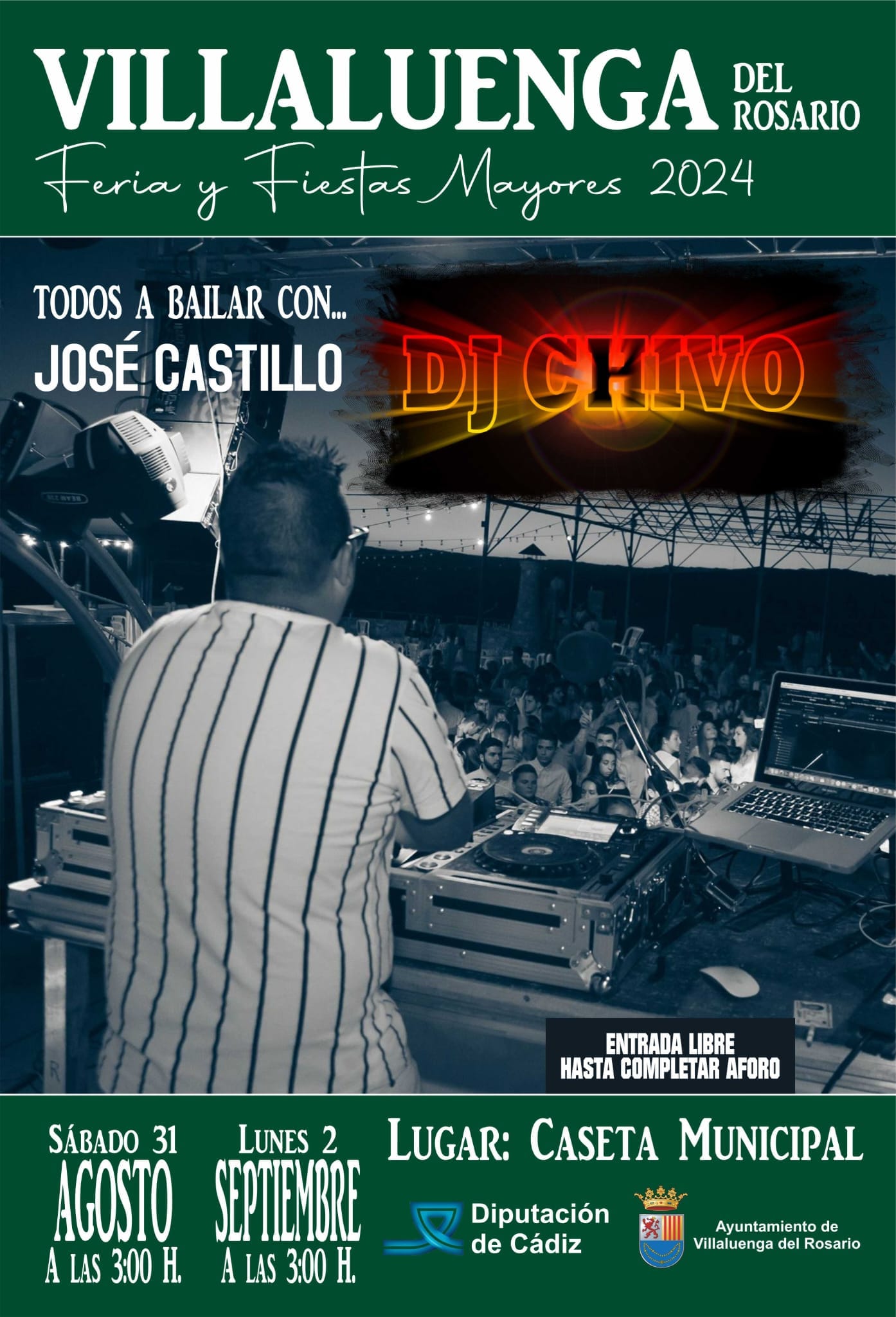 Todos a bailar con DJ Chivo en la Feria y Fiestas de Villaluenga del Rosario el Sábado 31 de Agosto y Lunes 2 de Septiembre a las 03:00h en la Caseta Municipal, con entrada libre hasta completar aforo.