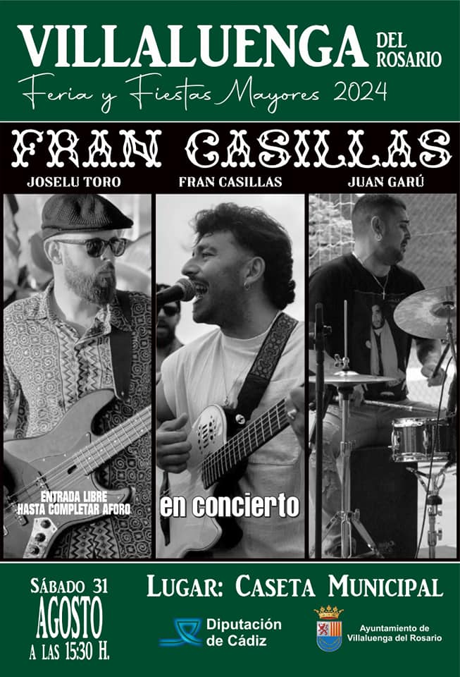 Actuación de Fran Casillas en Villaluenga del Rosario por su Feria y Fiestas Mayores el próximo 31 de Agosto a las 15:30h en la Caseta Municipal.