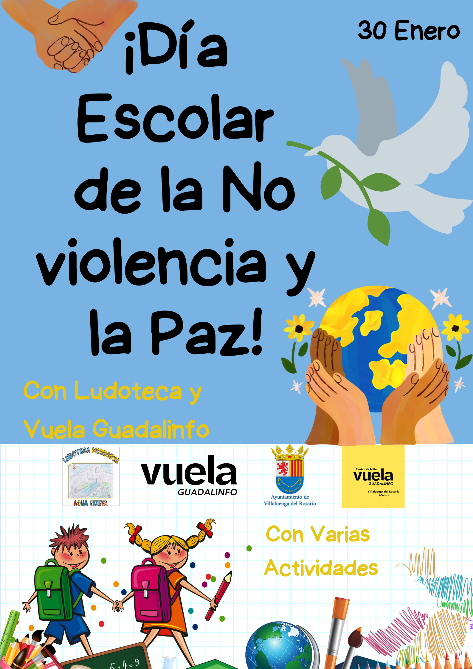 Desde el Centro de la Red Vuela Guadalinfo de Villaluenga del Rosario y la ludoteca municipal "Agua Nueva" vamos a conmemorar el Día Escolar de la No violencia y la Paz con varias actividades que desarrollaremos a lo largo de diferentes días.