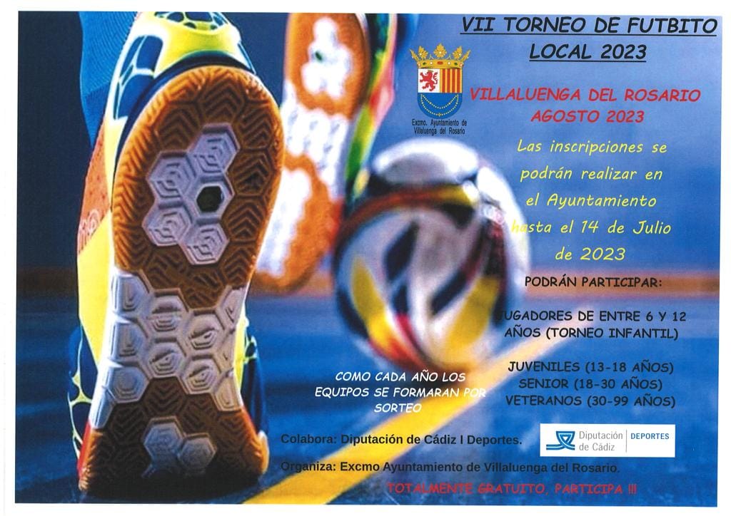 VII TORNEO DE FUTBITO LOCAL 2023 VII TORNEO DE FUTBITO LOCAL 2023. Organizado por el Ayuntamiento de Villaluenga del Rosario para el mes de Agosto. Las inscripciones podrán realizarse en el Ayuntamiento hasta el 14 de Julio de 2023.