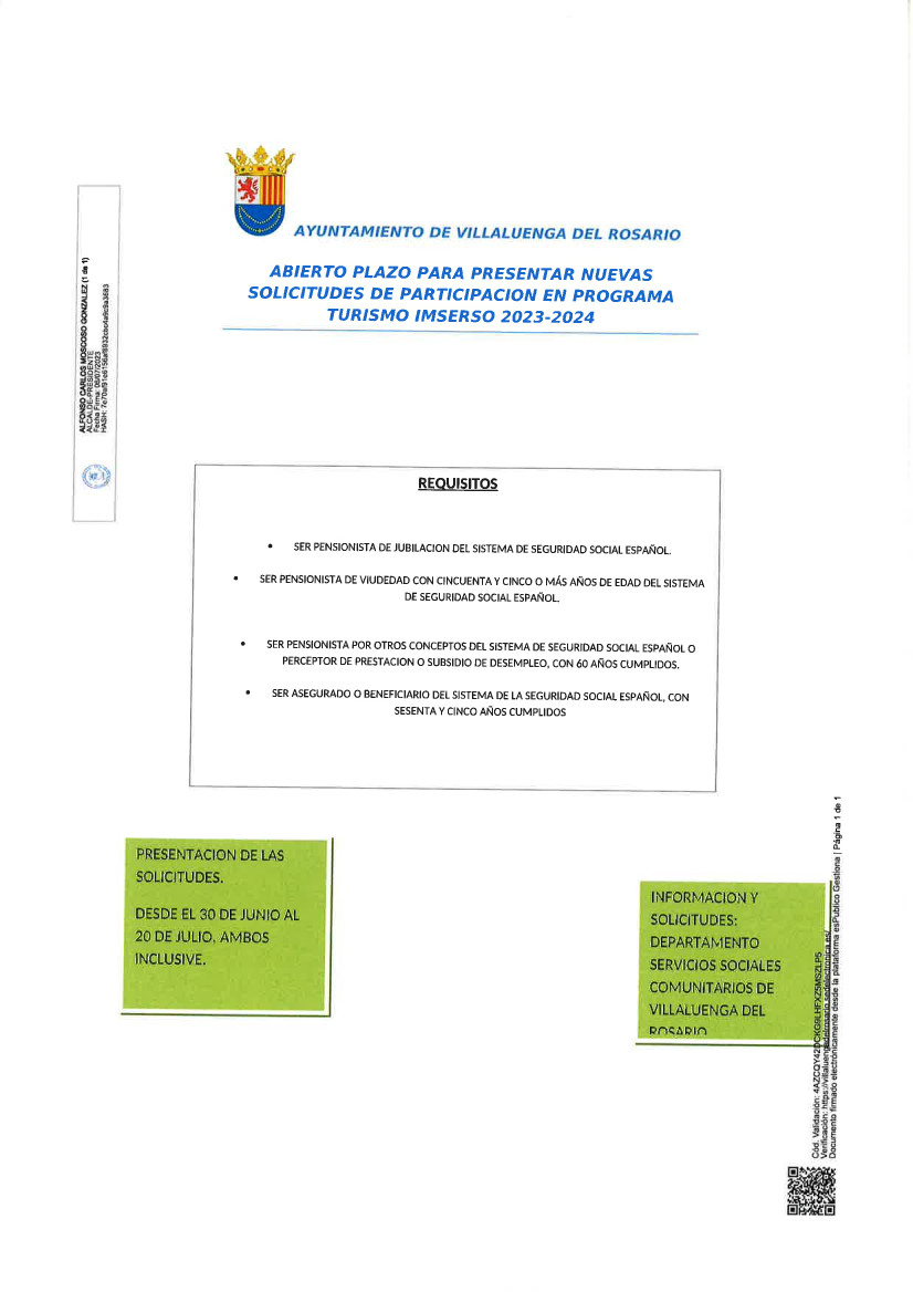 Desde el Ayuntamiento de Villaluenga del Rosario se informa de que está abierto el plazo para presentar nuevas solicitudes de participación en el Programa Turismo Imserso 2023-2024.