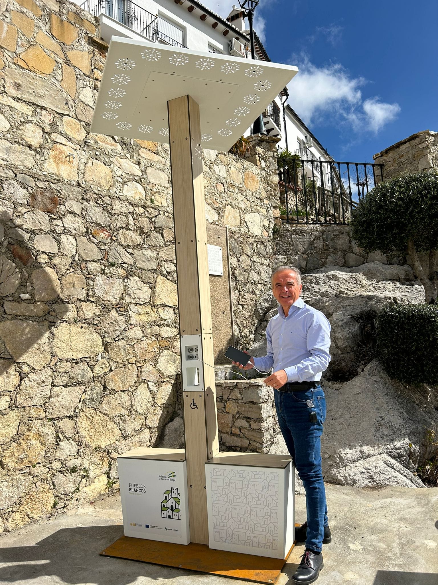 El Ayuntamiento de Villaluenga del Rosario instala en exteriores cargadores para móviles y IPAD que funcionan mediante energía renovable solar.