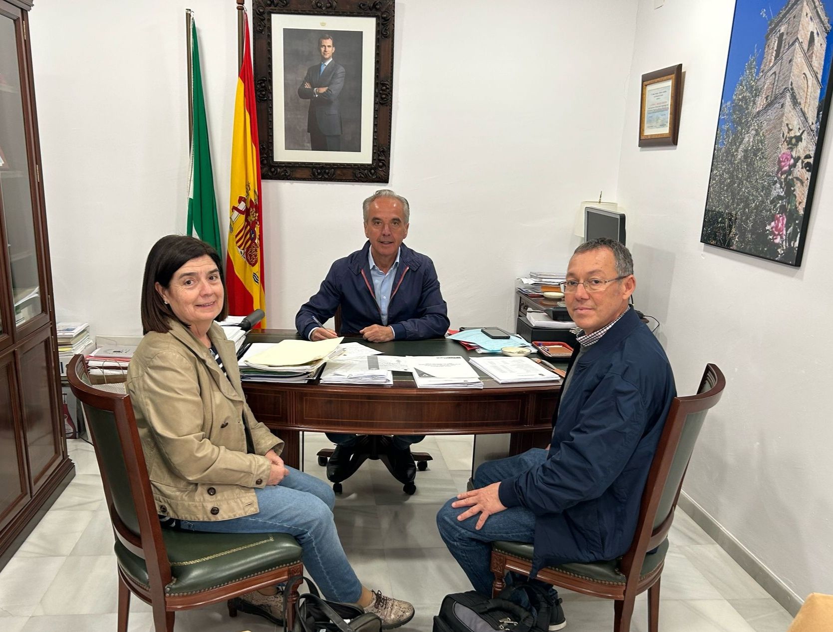 Reunión en el Ayuntamiento de Villaluenga del Rosario del alcalde de la localidad con técnicos de la Consejería de Salud de la Junta de Andalucía para coordinar medidas de prevención y protección frente al Virus del Nilo en el municipio.