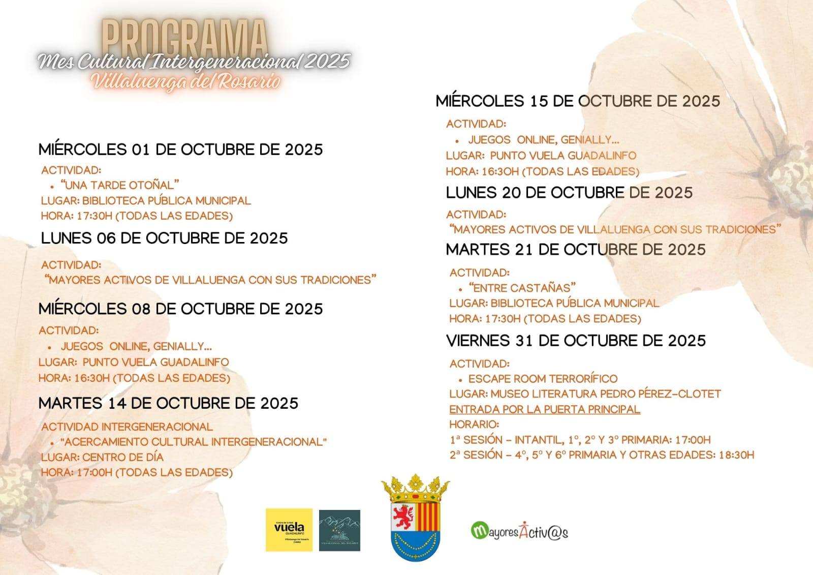 MES CULTURAL INTERGENERACIONAL 2025 Octubre en Villaluenga del Rosario será un mes lleno de cultura, costumbres y tradiciones. Disfruta del Mes Cultural Intergeneracional 2025 con actividades para todas las edades: talleres, juegos online, encuentros, y mucho más. Del 1 al 31 de octubre Diferentes espacios del municipio ¡Ven y comparte nuestra cultura!