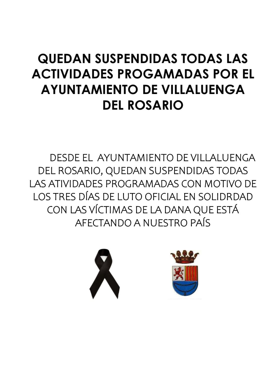 Desde hoy 31 de Octubre quedan suspendidas todas las actividades programadas por el Ayuntamiento de Villaluenga del Rosario con motivo de los tres días de luto oficial en solidaridad con las víctimas de la DANA.
