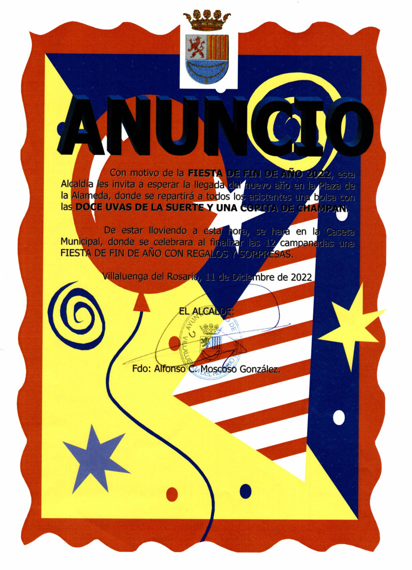 El Ayuntamiento de Villaluenga del Rosario organiza Fiesta de Fin de Año 2022, donde les invita a esperar la llegada del nuevo año 2023 en la Alameda o en la Caseta (si está lloviendo), donde se repartirán las 12 uvas y una copa de champán. Posteriormente se disfrutará de actuación musical.