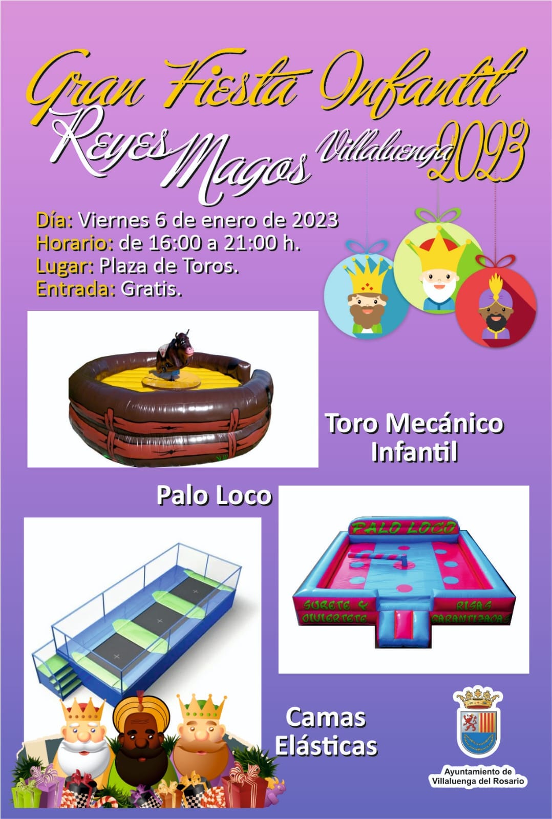 Día 6 de Enero, de 16:00h a 21:00h, tendrá lugar en Villaluenga del Rosario la "Gran Fiesta Infantil Reyes Magos 2023", en la Plaza de Toros con Entrada GRATIS.