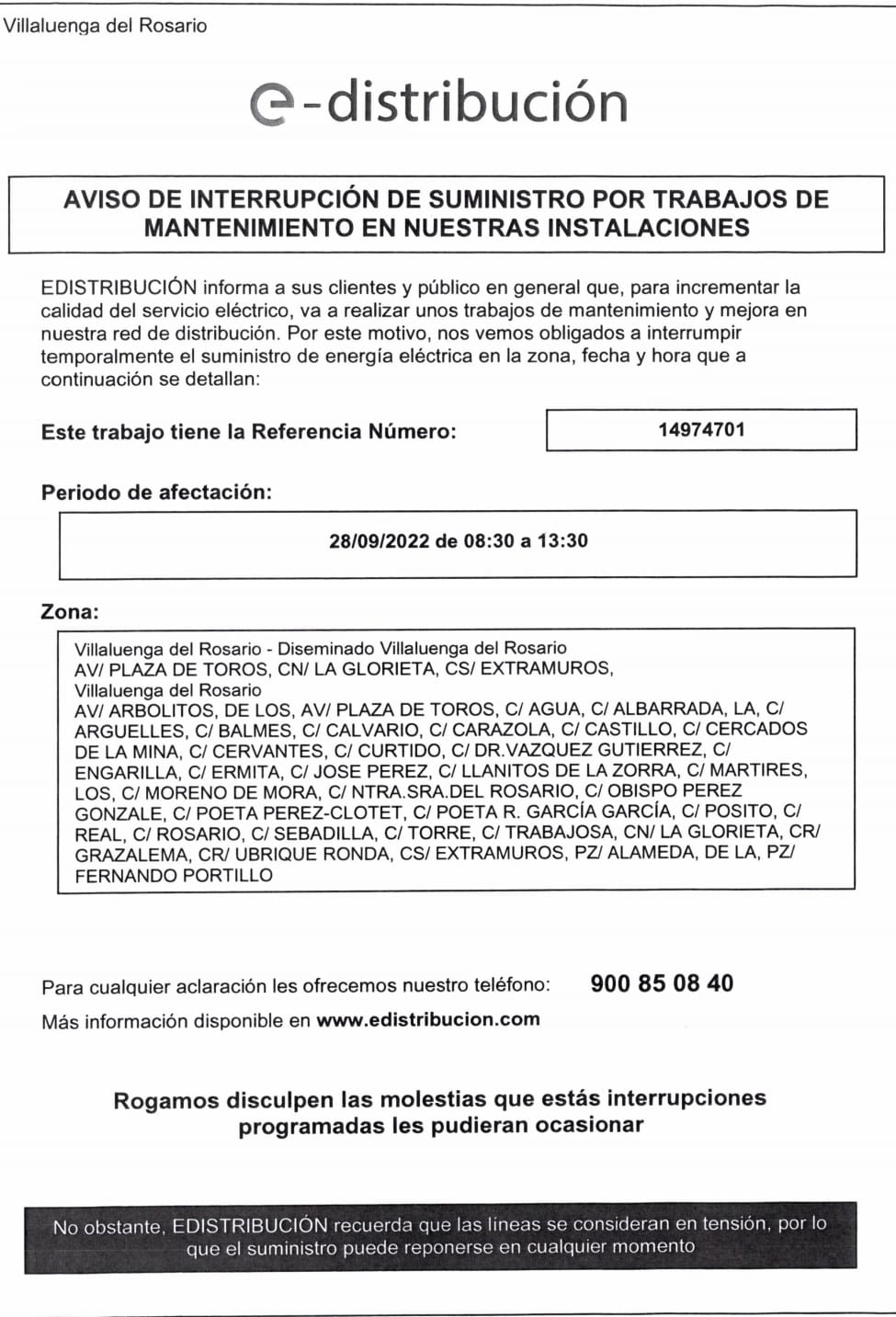 Aviso de Interrupción de Suministro Eléctrico el próximo Miércoles 28/09/2022 de 8.30 a 13.30 horas en Villaluenga del Rosario.