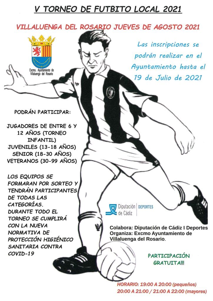V TORNEO FUTBITO LOCAL 2021 El Ayuntamiento de Villaluenga del Rosario organiza el Tradicional Torneo de Futbito Local Verano 2021 Inscripción: gratuita hasta el 19/07/2021 en el Ayuntamiento Partidos: todos los Jueves de Agosto Torneo sometido al cumplimiento de la normativa Higiénico-Sanitaria Covid-19